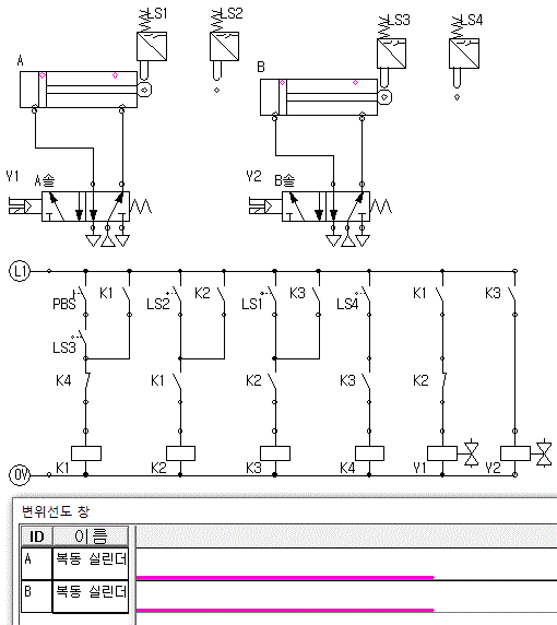 시작 스위치 PBS를 누르면 실린더 A가 중력매거진에서 떨어진 부품을 밀어낸 후 즉시 복귀한다.