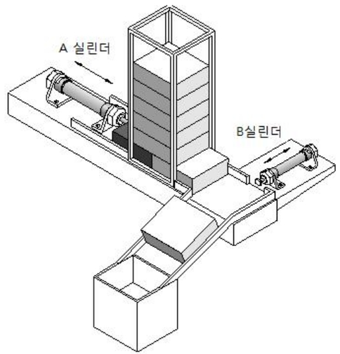 복귀하고 나면 실린더 B가 전진을 해서 부품을 아래 칸으로 밀어낸다.