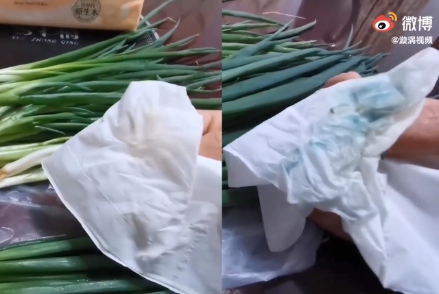 지난 11 일 웨이보 등 중국 SNS 에는 가판대 위의 대파를 닦자 청록색 색소가 그대로 묻어나오는 영상이 공개되면서 현지 누리꾼들이 분노하고 있다.