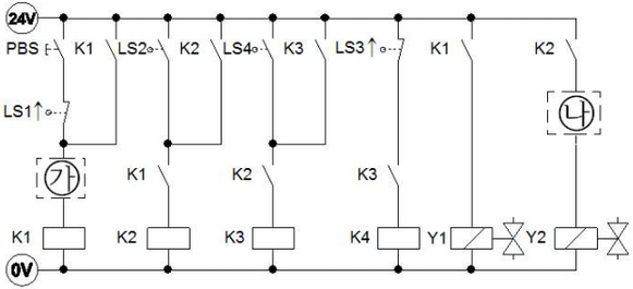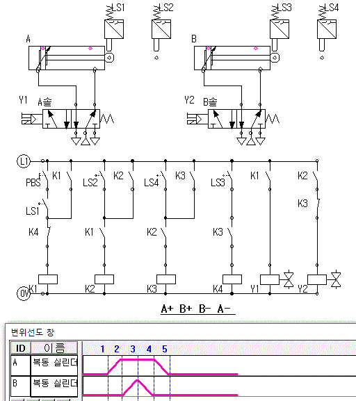 클램핑 작업은 누름 버튼 스위치(PBS)를 ON-OFF 하면 실린더 A가 전진하여 작업물이 고정되면,