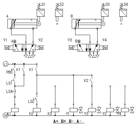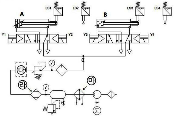 동작 순서(A+ B+ B- A-)에 맞게 솔밸브를 배치한다.