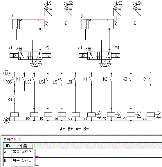 실린더 A가 후진완료 한 후 실린더 B가 복귀하는 시스템이다.