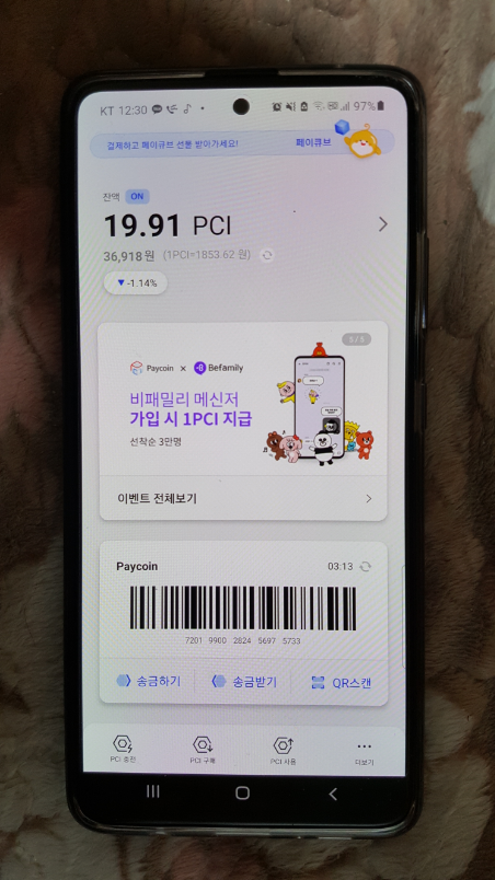 아래 사진은 현재 제가 적립한 PCI입니다. 20PCI가 되면 코인 거래소인 업비트로 송금을 해서 거래로 사용할 수 있습니다. 처음에는 가입포인트로 5PCI 또는 7PCI가 적립되어 있을 겁니다. 저는 7PCI가 적립이 되었네요