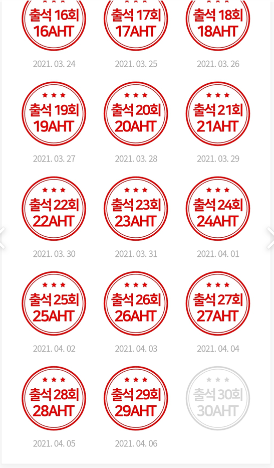 코인 획득 점수가 출석1회는 1AHT ~ 출석 30회는 30AHT로 누적됩니다.