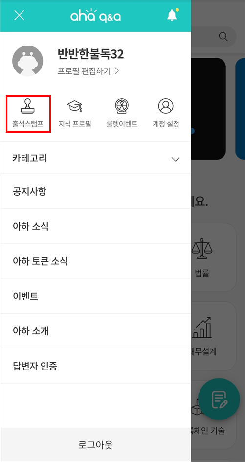 (1) 츨석체크 : 사이트에 접속해서 왼쪽 상단 메뉴버튼을 누릅니다. 그리고 출석 스템프를 누릅니다.