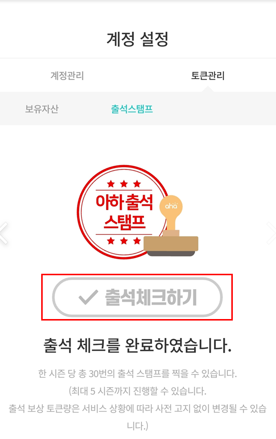 적립된 코인을 확일하려면 '메뉴 - 계정설정 - 토큰관리'에서 확인 가능합니다.