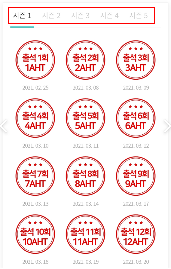 한 시즌에 30번 출석해서 최대 5시즌까지 150번 출석 점수를 얻을 수 있습니다.