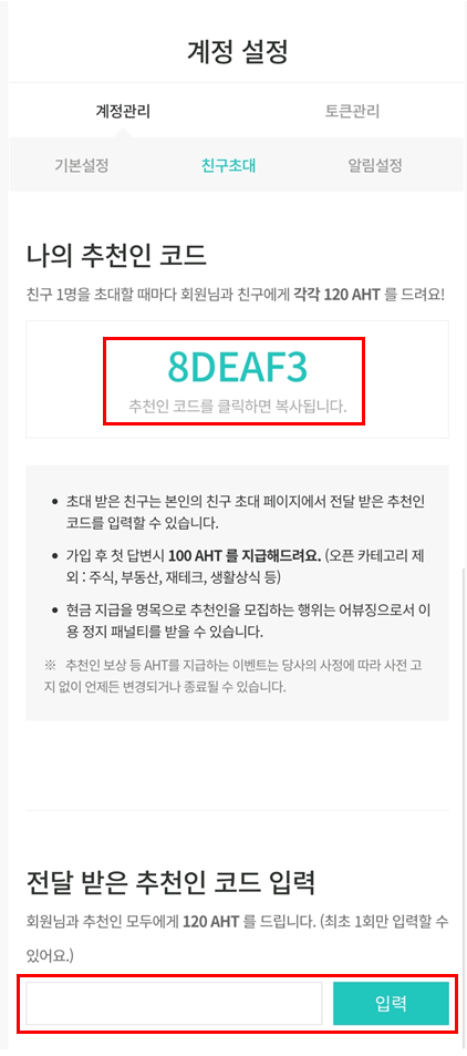 - 가입시 추천인 코드를 넣으시면 120AHT를 지급 받습니다