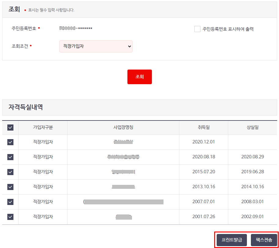 3. 자격득실확인서의 조회란에 조회조건(저는 직장가입자)을 입력하고 조회를 합니다.