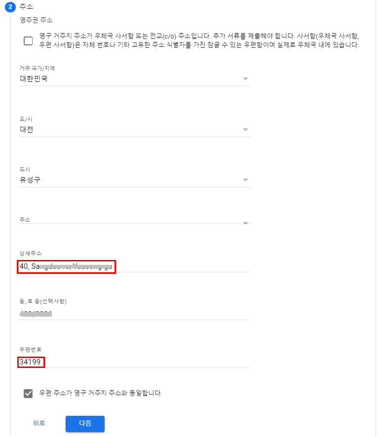 개인인 경우는 '개인 이름'(여권 이름)과 국가(대한민국)만 입력하고 다음으로 넘어갑니다.