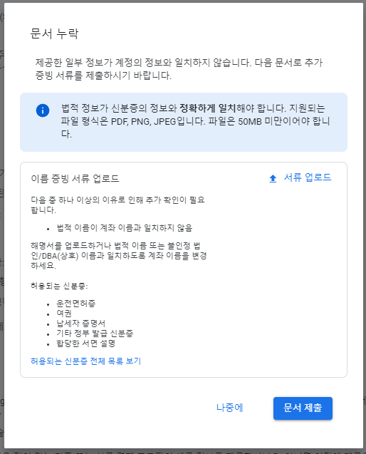 계속해서 '정보확인을 위해 추가서류제출'이라고 메세지가 떠서 검색을 해보니 아래와 같은 이유인 것 같습니다.