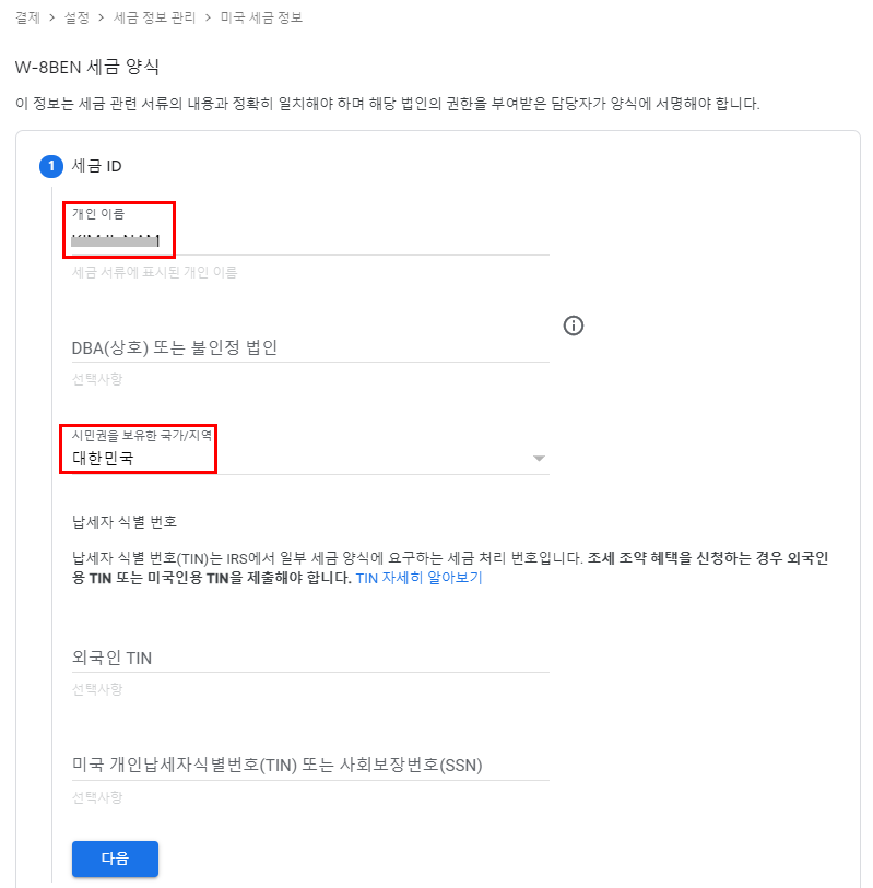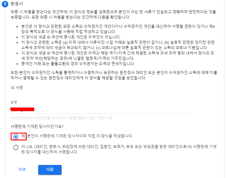 저는 개인 블로거이기 때문에 '계좌 유형'을 '개인', '미국 시민 또는 거주자'는 '아니로'로 체크하고 넘어가겠습니다.