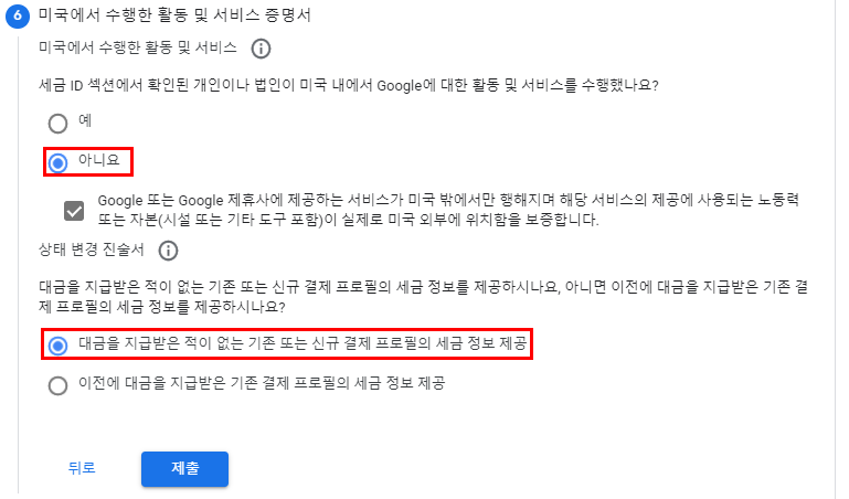 다음은 '미국에서 수행한 활동 및 서비스 증명서' 입니다. 본인이 미국에서 활동해서 수익이 발생하는 경우 '예'를 눌러야 하나 우리는 '아니오'를 선택합니다.