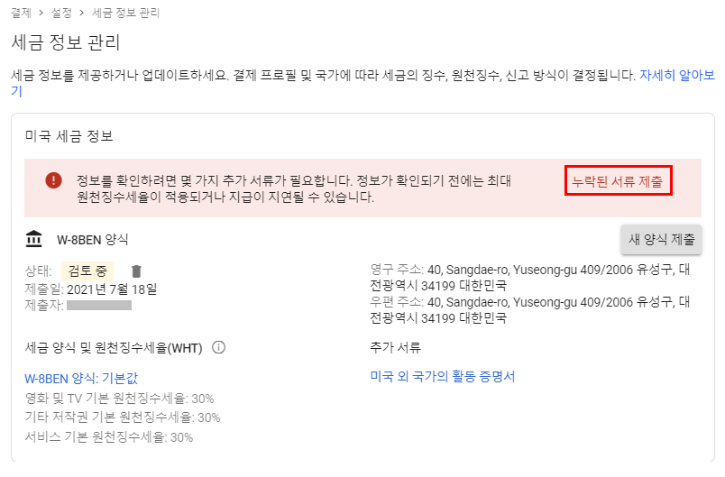 2021년 5월 21일 까지 '미국 세금 정보'를 입력해야 한다고 합니다. 만약 이때까지 등록을 하지 않으면 24%의 세금을 적용한다고 합니다. 그러나 현재 2021년 7월 18일인데 일단 늦게나마 입력을 해 봅니다.