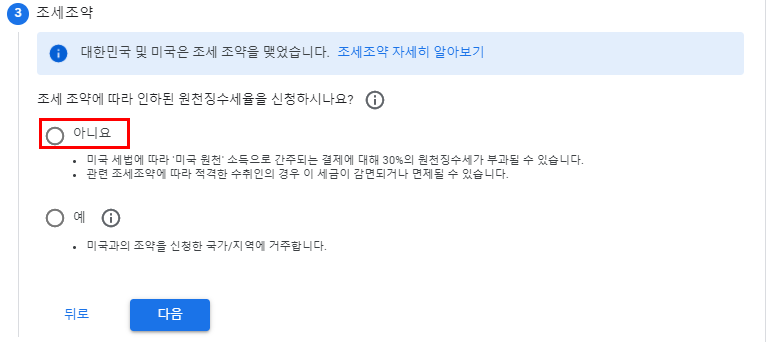 다음은 '조세조약'란에서 사업자가 아닌 개인인 경우는 '아니오'를 선택해주세요.