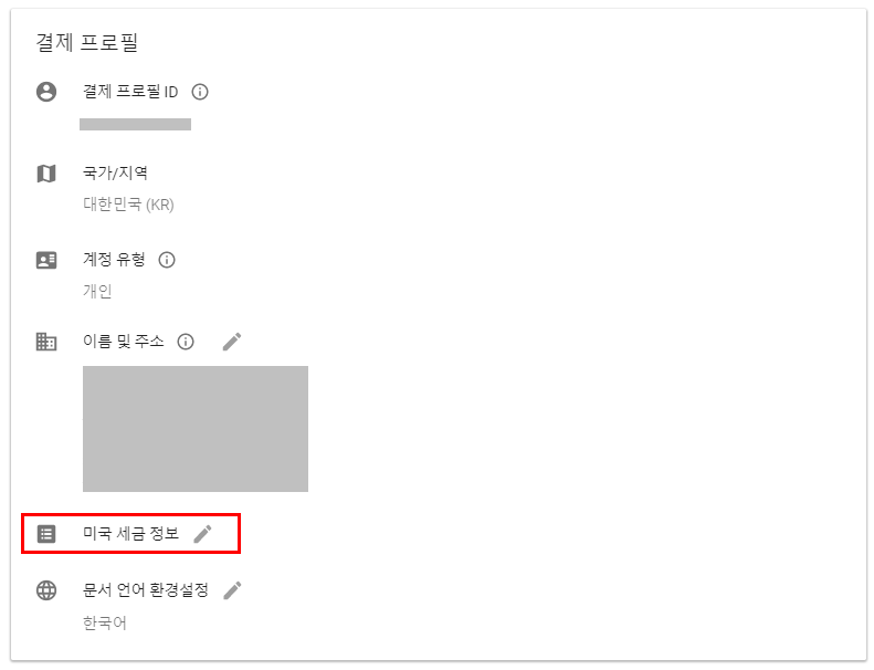 3. '지급 - 설정관리 - 결제 프로필 - 미국 세금 정보'에 있는 이름도 같은 형식(Hong Gildong)으로 수정