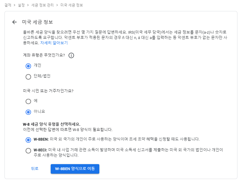 그리고 'W-8 세금 양식 유형'이 있습니다. 이것은 미국인을 상대로 수익을 내는 형태이면 W-8ECI을 선택해주는데 저는 미국 이외의 나라에서 개인적으로 수익을 내기 때문에 W-8BEN을 선택합니다.