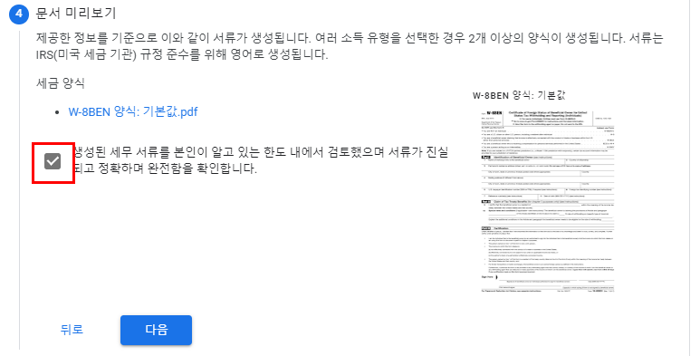 문서 미리보기에서 체크를 한 후 다음을 눌러 넘어갑니다.