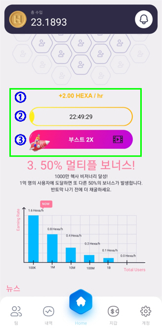 ① 시간당 1.6개(1.6Hexa/h)를 채굴할 수 있습니다. 저는 한 분을 추천해서 시간당 2.0개로 조정되었습니다.