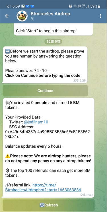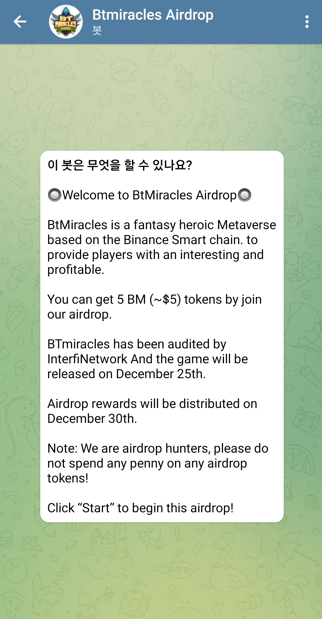 가입경로(텔레그램) : https://t.me/BtmiraclesAirdropbot?start=1663063886