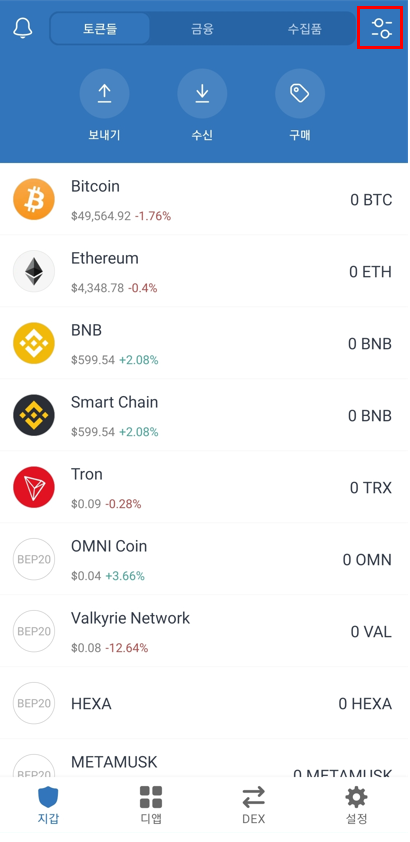 트러스트 월렛은 아래와 같이 설치가 되어 있어야 합니다. 앱을 실행하고 오른쪽 위 아이콘을 클릭해줍니다.