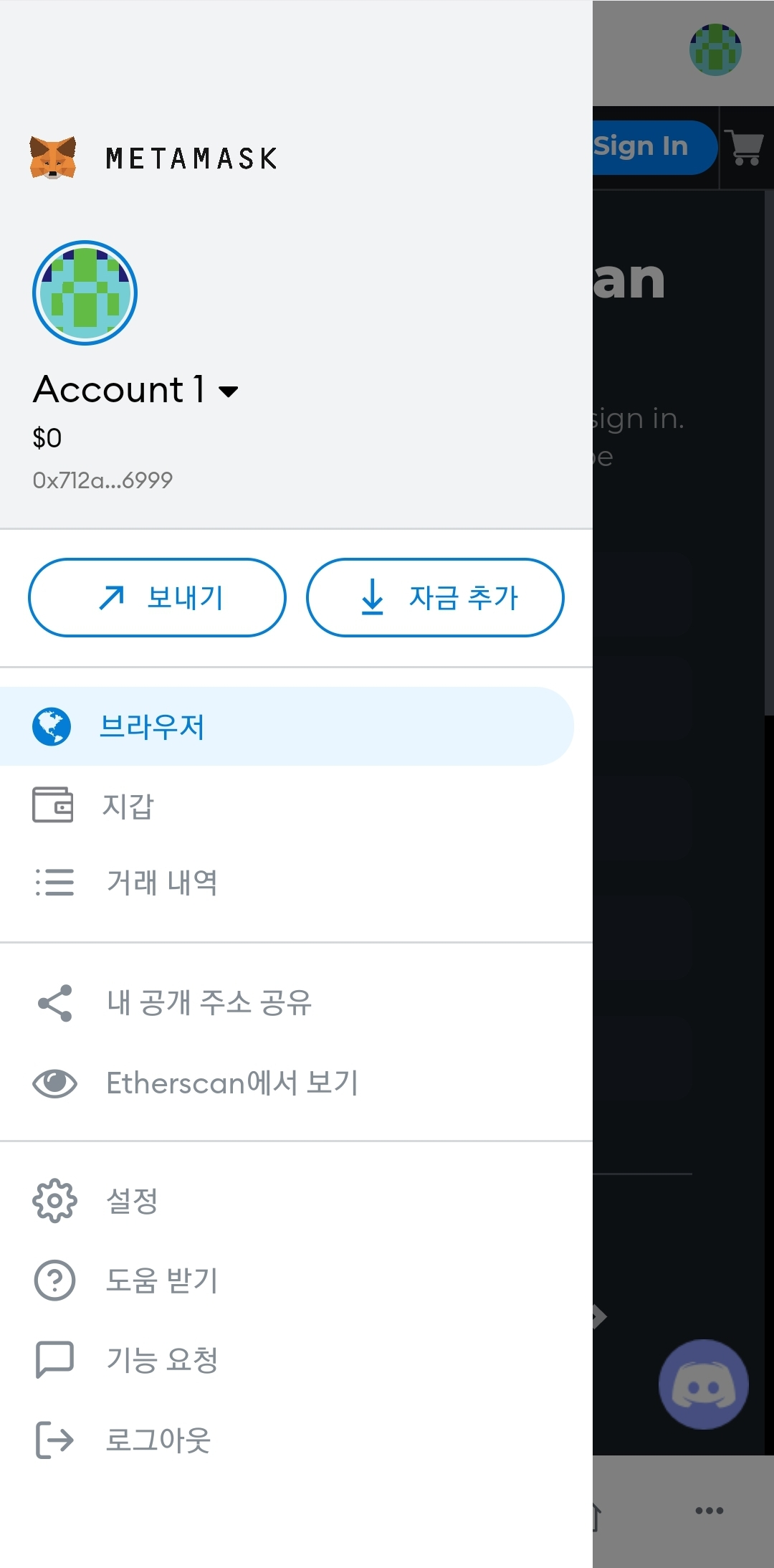 일단 메타마스크가 설치되어 있어야 한다. 메타마스크를 실행해서 지갑을 연다. 그리고 왼쪽 삼선을 눌러서 '브라우저'를 열어둔다.