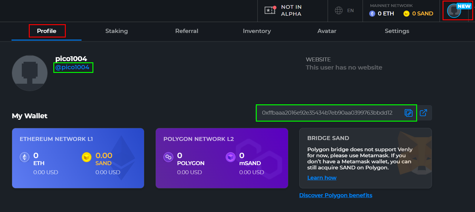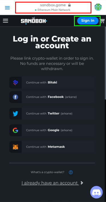 오른쪽 상단 '계정아이콘-프로필'로 들어가면 아래의 화면이 나온다. 브라우저가 열리면 상단을 클릭해서 주소(sandbox.game/en/season/)를 입력 후 들어간다. 그리고 SIGN IN을 눌러 가입을 하면 되는데 PC버전에서 하는 것을 추천한다.