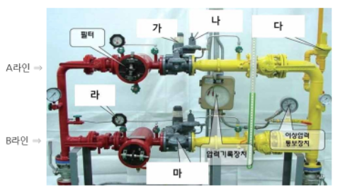정답) A라인 가)조정기 나)파이롯트조정기 다)안전밸브 라)차압계 마) 긴급차단장치
