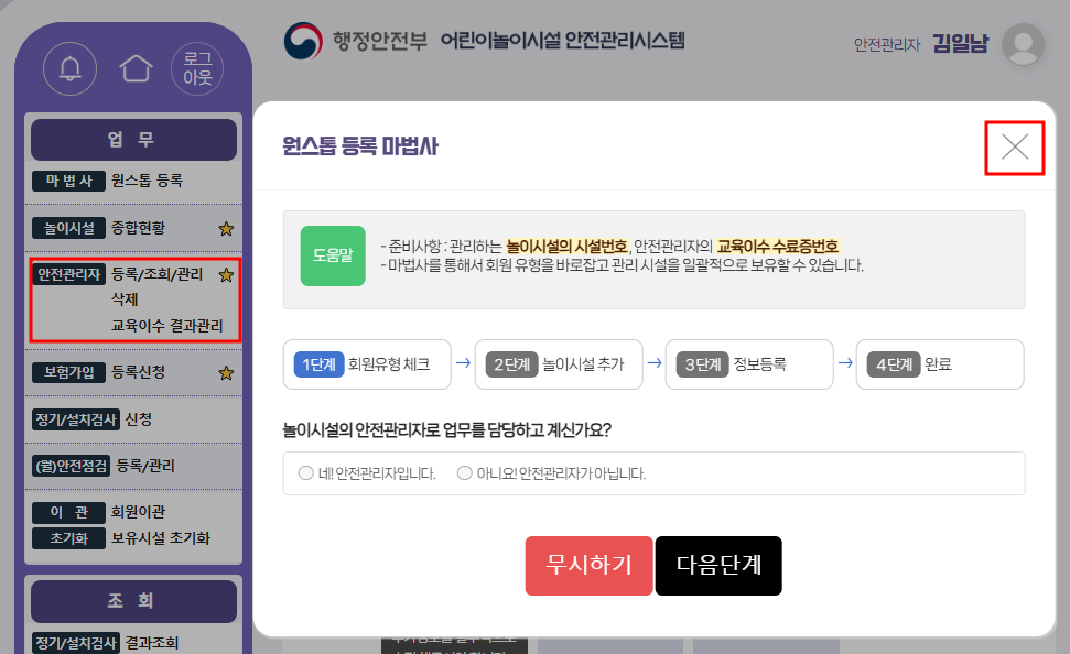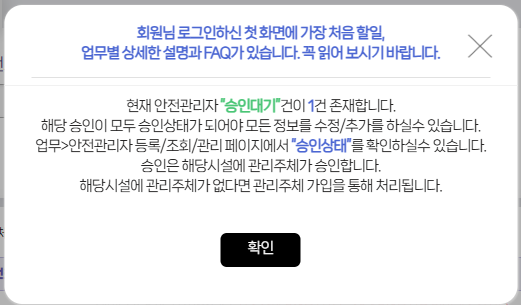 아래는 '원스톱 등록' 마법사로 하지 않고 '안전관리자' 등록/조회/관리로 들어가서 진행하는 경우입니다.