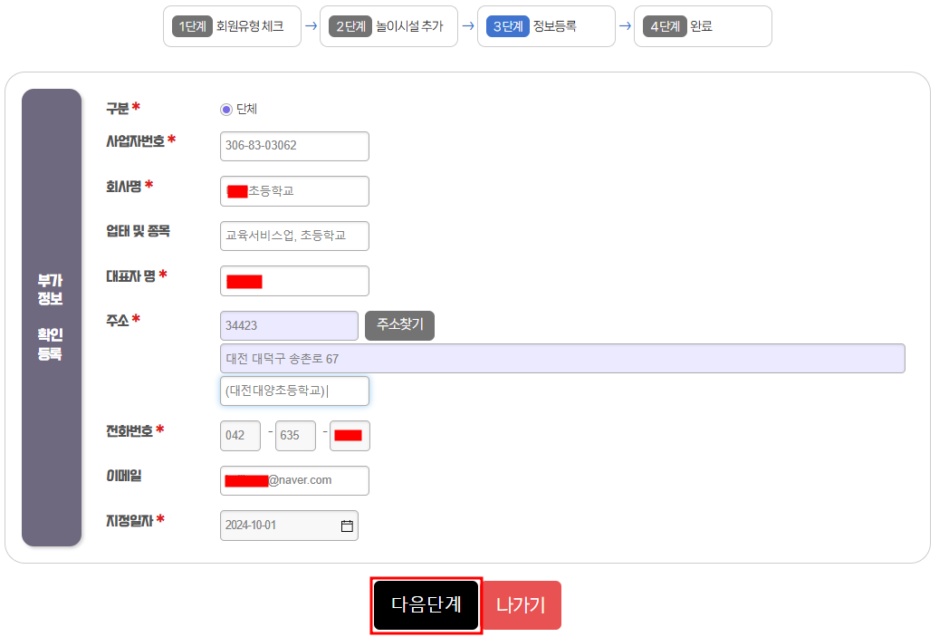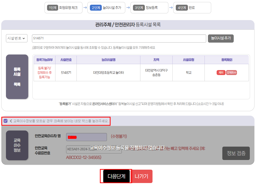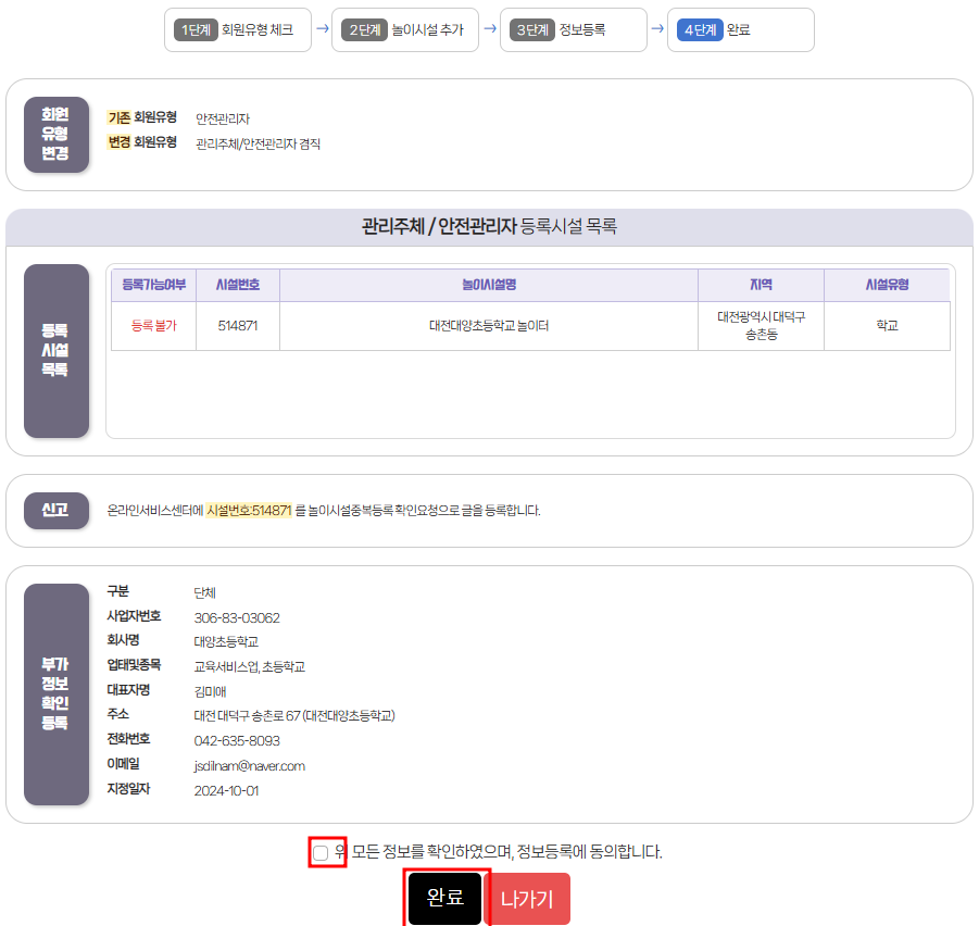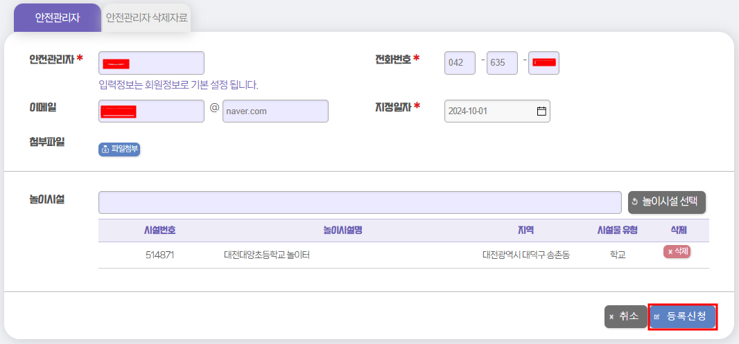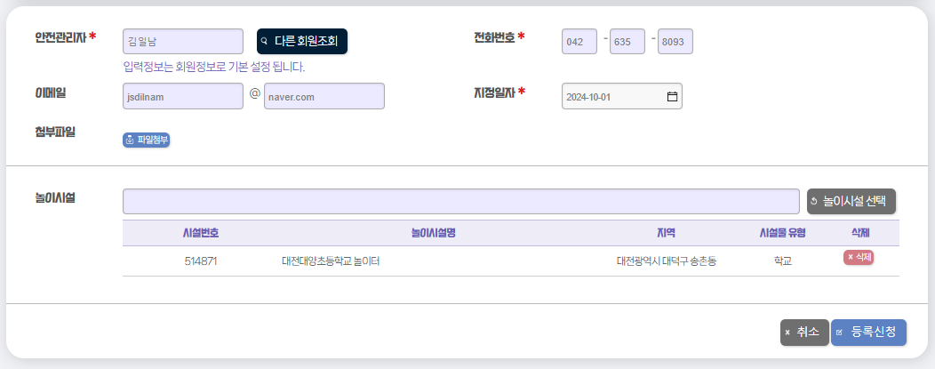 놀이시설 정보와 안전관리자 정보를 등록하는 화면이 나옵니다.
