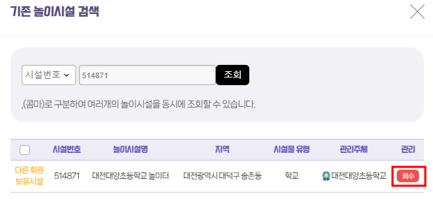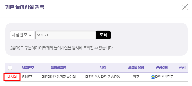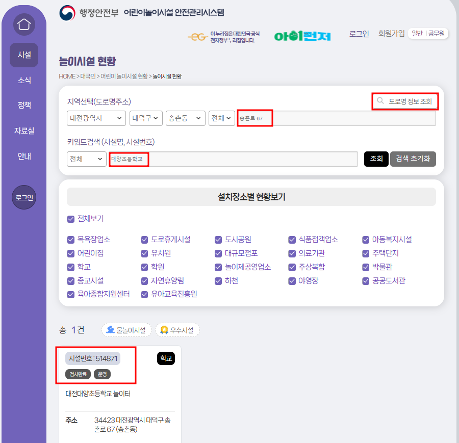 아래와 같이 도로명 주소와 시설명(시설번호)을 넣고 조회하여 '시설번호'를 확인합니다.