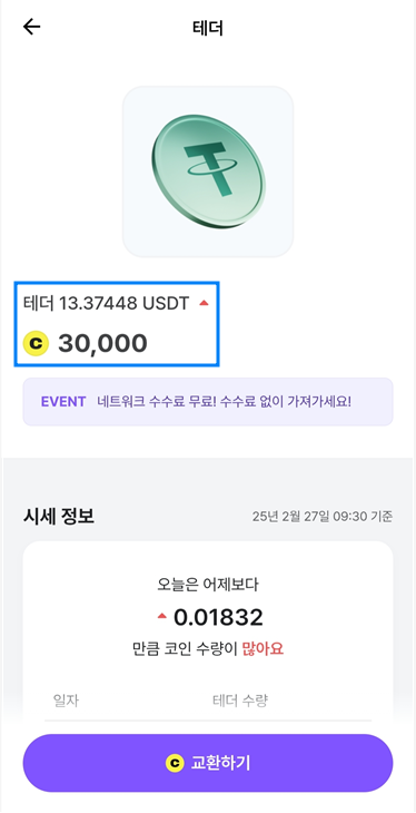 이제 포인트가 30000점으로 암호화폐 '테더'를 구입하겠습니다.