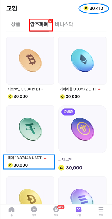포인트를 모아 30,000점이 되면 암호화폐를 구입할 수 있습니다.