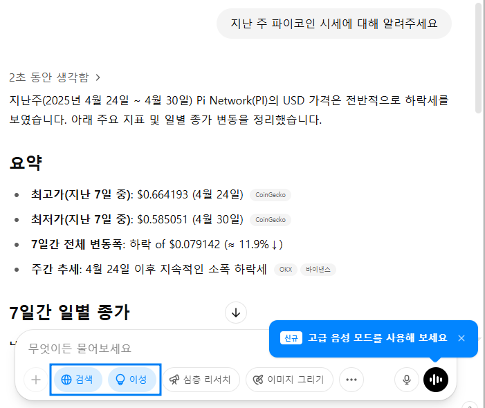 화면 중간에 검색과 이성 아이콘은 클릭하고 같은 질문을 해보겠습니다.
