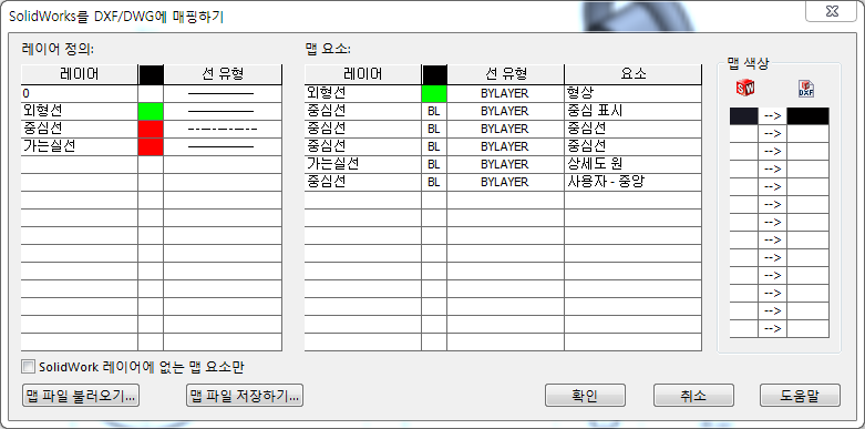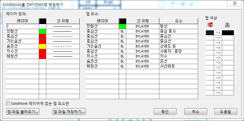 현재 솔리드웍스에서 사용하고 있는 요소들을 대응시켜준다.