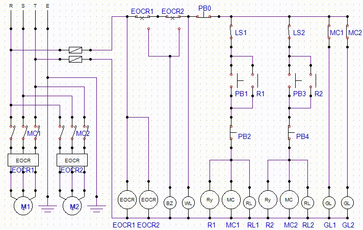 ③ PB3을 누르면 R2와 MC2가 여자되어 전등기 M2이 동작되고, RL2 점등, GL2 소등된다.