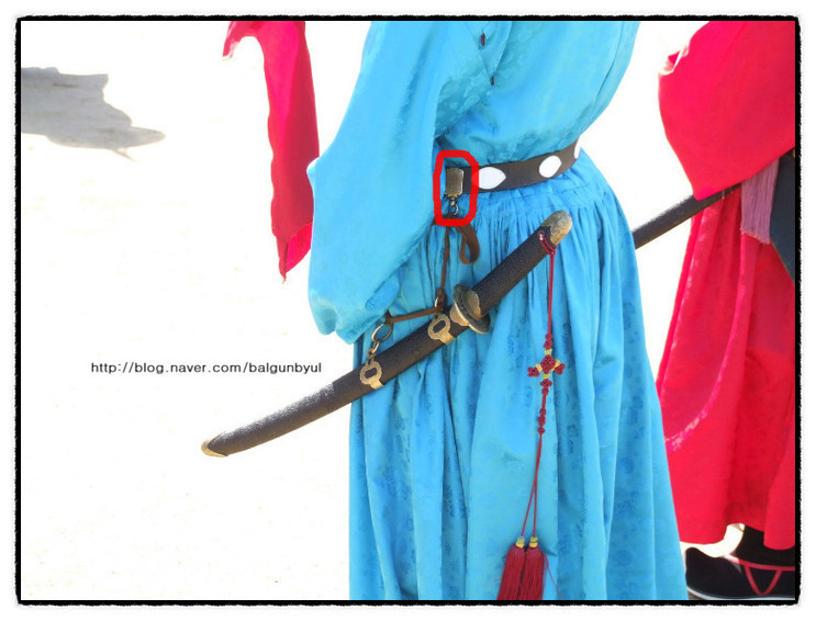칼 뽑을 때 칼자루를 앞으로 돌리기 쉽도록 띠돈을 사용함.