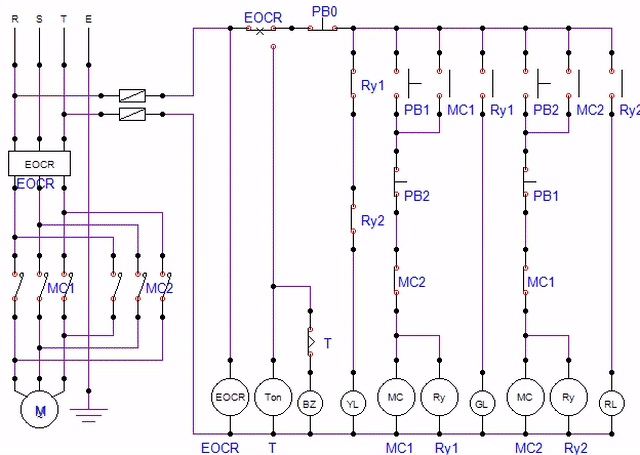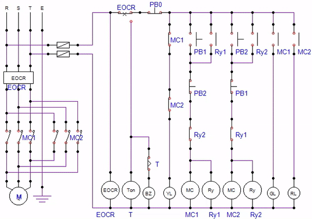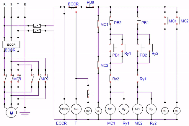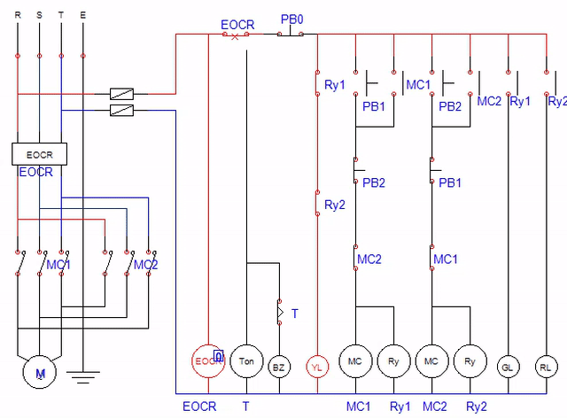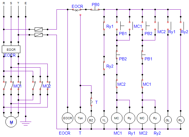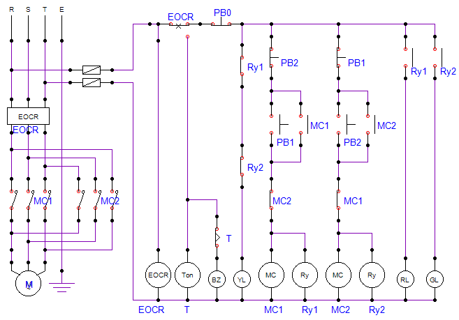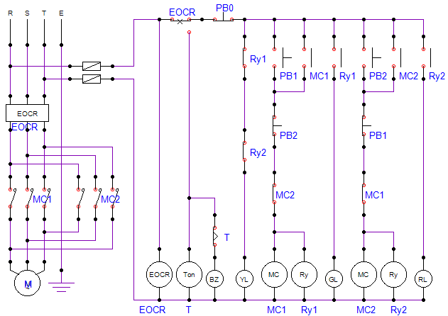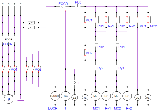 ⑤ EOCR이 동작하면 모든 동작이 정지. 타이머T가 여자 부저(BZ)가 울리고 t초후에 부저는 멈춘다.