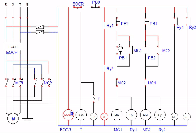 ③ PB2을 누르면 MC2, Ry2이 여자되어 전동기(M)가 역회전한다. RL이 점등되고 YL이 소등.
