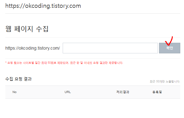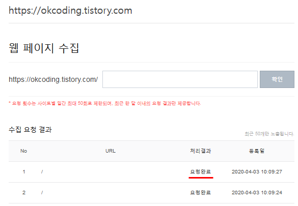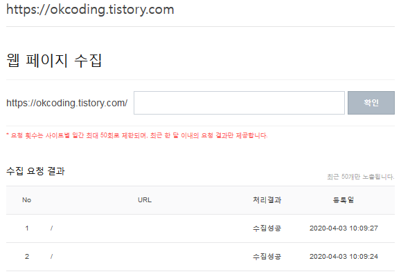 다시 페이지 새로 읽기를 해보면 '수집성공'이라고 뜨는데 결과는 없다.