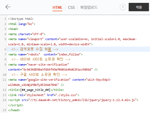 아래와 같이 명령어를 <head>~</head> 태그 사이에 입력하고 적용을 눌러 저장한다.