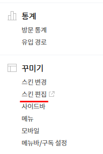 왼쪽 메뉴 '꾸미기-스킨 편집'을 누르면 새창이 뜬다.