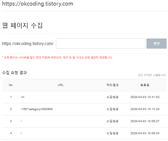 위에 '웹페이지 수집'에서 수집 오류가 생기면 모바일 주로로 수집요청을 할 수 있다.