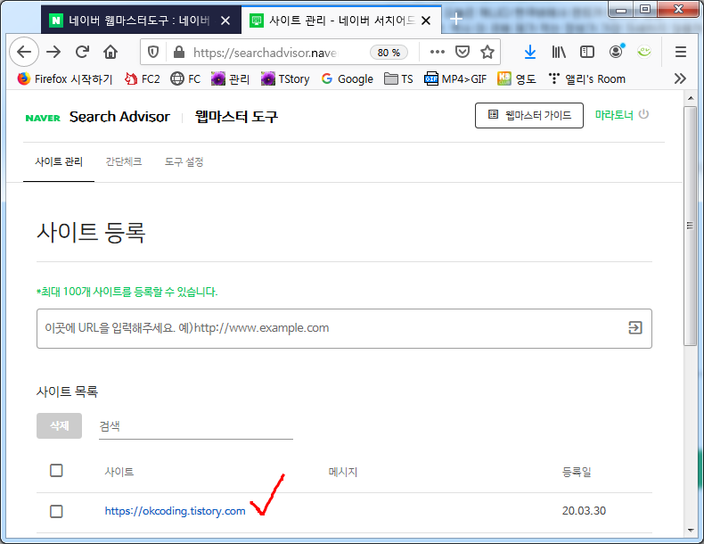 그리고 네이버 '웹마스터도구-사이트등록' 페이지로 가서 확인을 해본다.