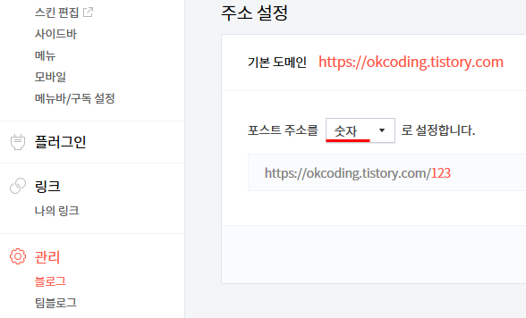 관리자모드에서 '관리-블로그'로 들어가서 주소 설정이 숫자로 되어 있어야 한다.
