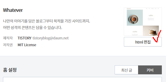 왼쪽 메뉴 '꾸미기-스킨 편집'을 누르면 새창이 뜬다.