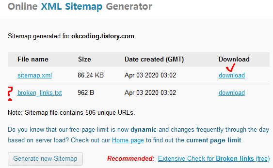 사이트맵 제작이 완료되면 'download your Sitemap'을 누르고 'download'를 눌러 다운로드 한다.