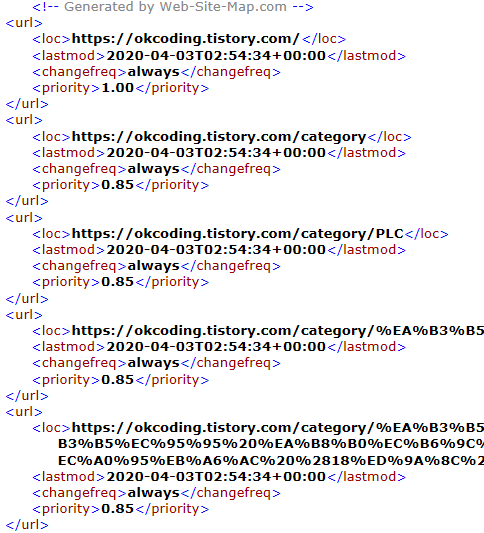 사이트맵(sitemap.xml) 파일을 열어보면 아래와 같다.