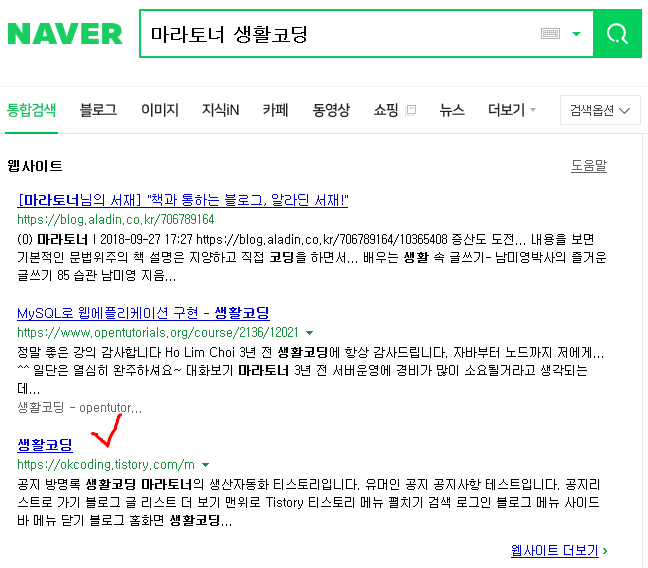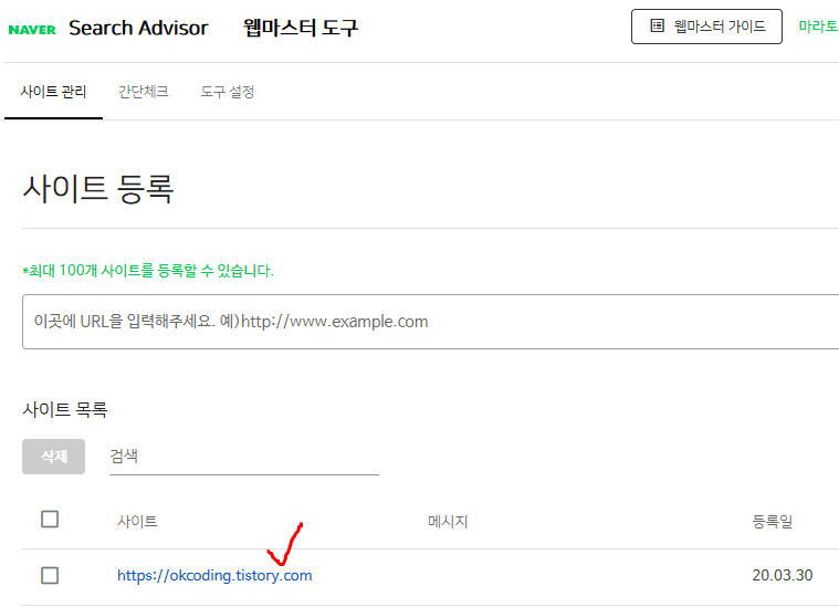사이트 등록 페이지의 사이트 목록에 있는 티스토리 주소를 클릭해 들어간다.