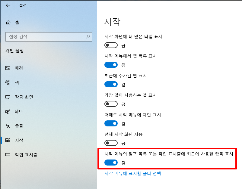 설정 - 개인정보 - 작업기록 - 이 장치에 내 활동 기록 저장 체크해제 - 활동기록 지우기 [지우기]클릭
